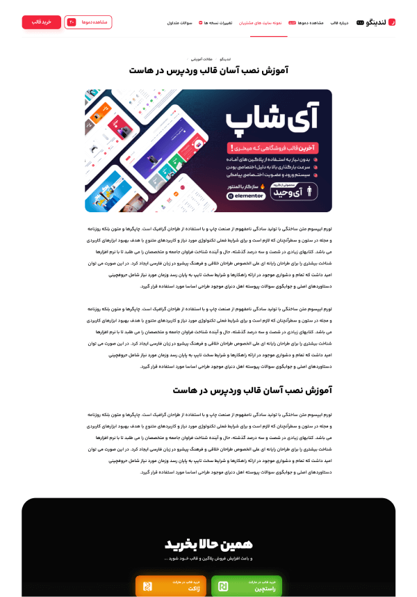 اگه یه لندینگ پیج سریع و حرفهای میخوای، لندینگو رو از دست نده! این قالب با پشتیبانی از صفحهساز المنتور و طراحی مدرن، بهت کمک میکنه بدون هیچ دردسری، لندینگ شگفتانگیز بسازی. از لحاظ فنی هم، لندینگو یه انتخاب فوقالعادهست! سرعت لود بالا، بهینهسازی حرفهای باعث شده که صفحات ساختهشده با این قالب، بهترین عملکرد رو ارائه بدن.🎯